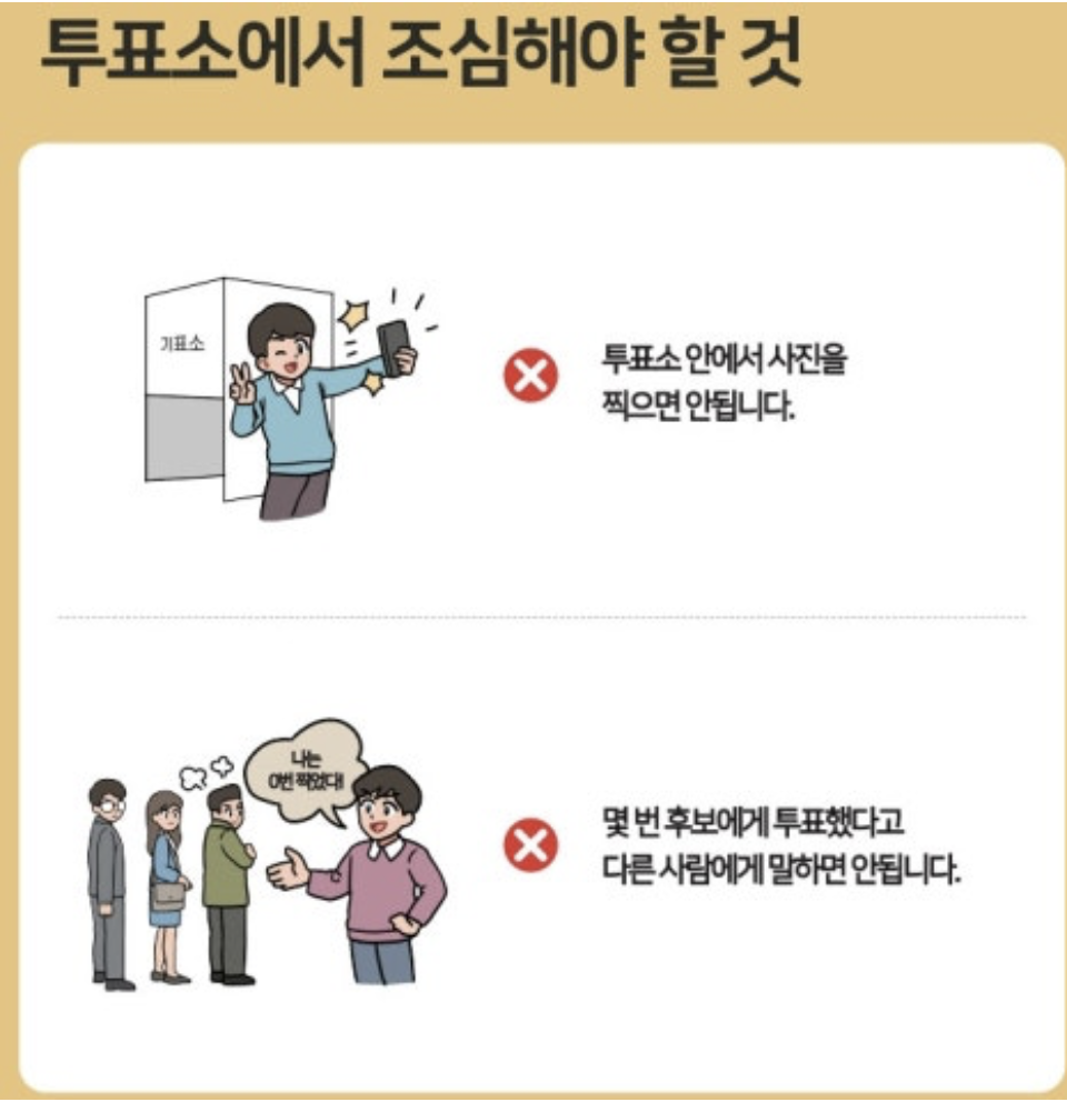 - 투표용지 촬영 금지: 기표소 안에서 촬영 행위는 불법입니다.